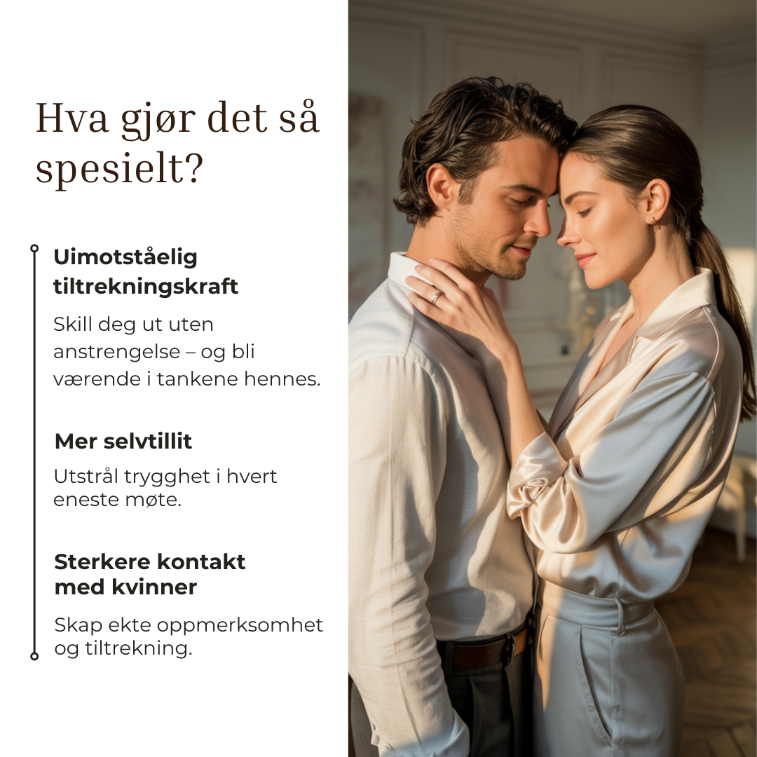 Vår trygge, EU-sertifiserte blanding forsterker din naturlige kjemi – uten en overveldende duft, men med en raffinert touch.